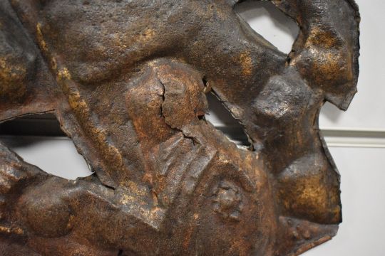 A rare and interesting 16/17th century George and the Dragon tin pub sign with age related patina, 50cm x 69cm.