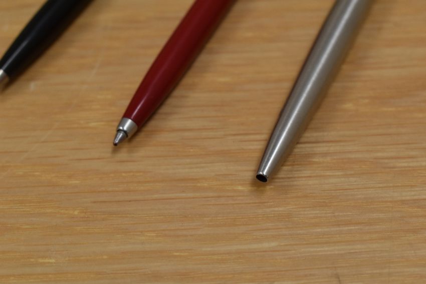 Four Parker Jotter ballpoint pens teal, red, brushed steel, black (black advertising SAGA Insurance).