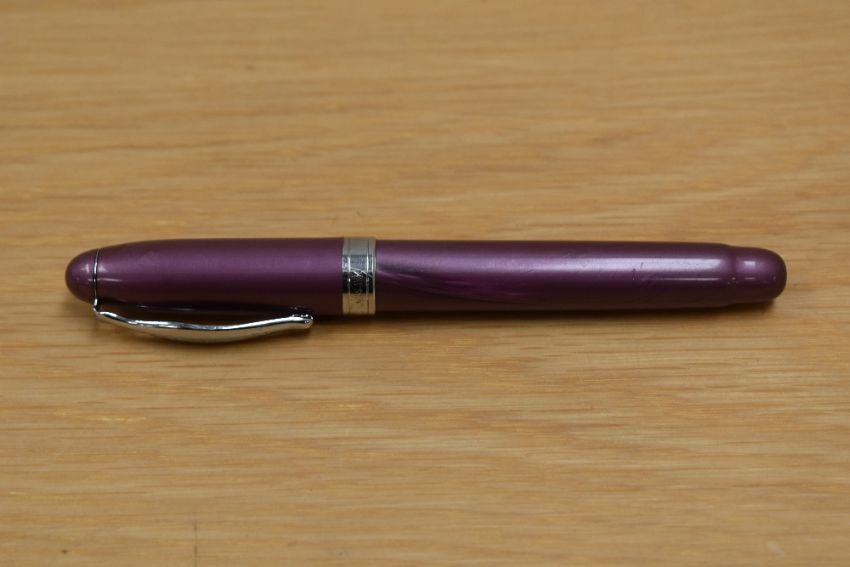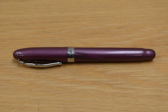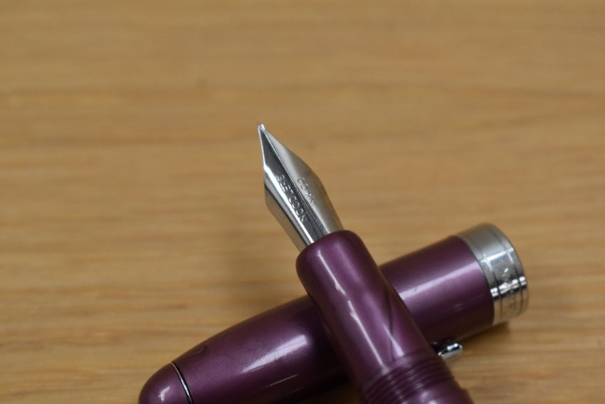 A Noodlers Ink plunger fill fountain pen in purple with a Noodlers Ink Co. nib.