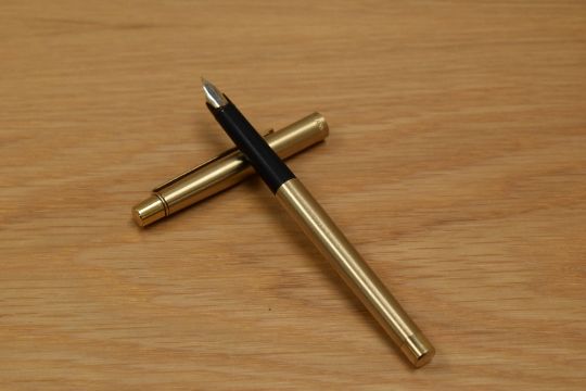 A Papermate cartridge fill fountain pen, ballpoint pen and propelling pencil set in brushed gold, the fountain pen having a Papermate steel nib.