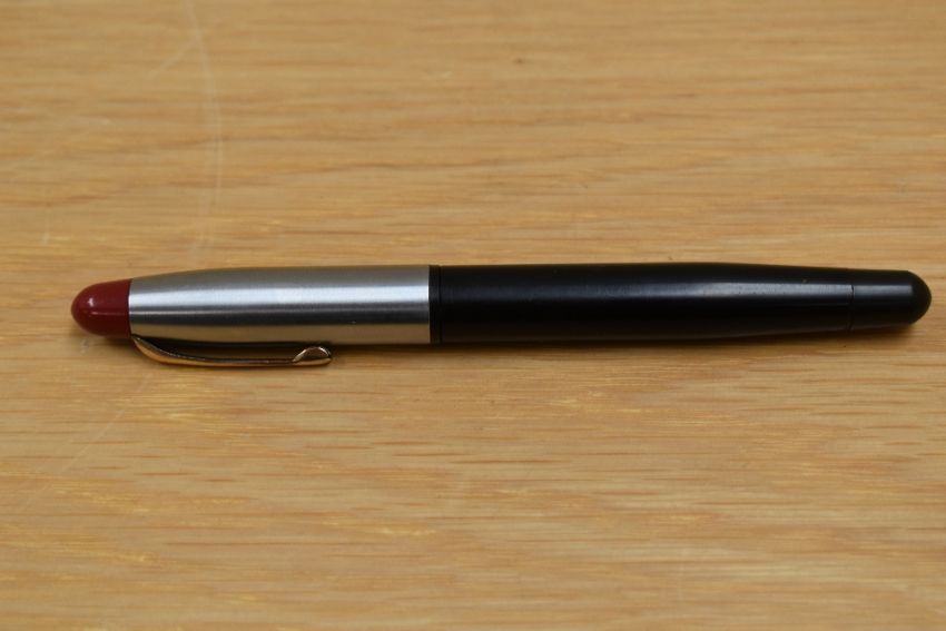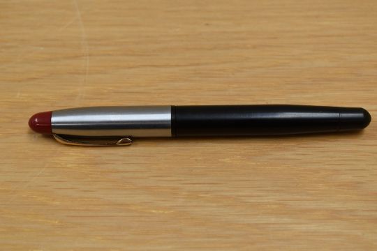 A Voss button fill fountain pen in black with brushed steel cap and red tassi with gold trim having a Voss 14ct Osmi-Iridium nib.