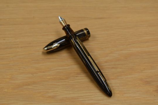A Sheaffer Lifetime lever fill fountain pen in brown striated design having military clip with a Sheaffer Feather Touch made in USA 5 nib. Length 13cm incl cap.
