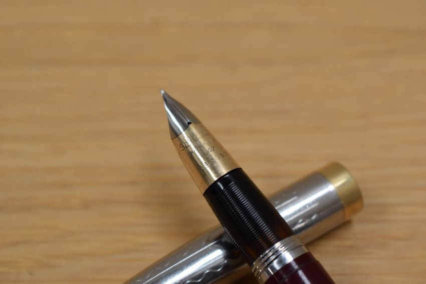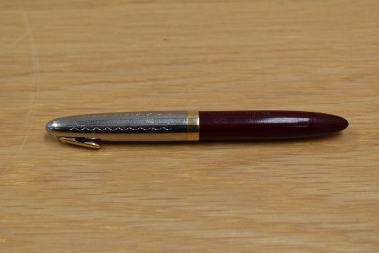 A Sheaffer Sentinal Tuck Away plunger fill fountain pen in burgundy with silver cap with gold trim and military clip having Sheaffer made in USA 14K 0820878 nib. Engraved.