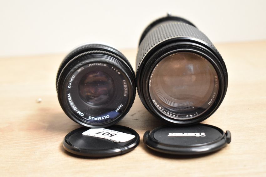 An Olympus OM10 camera with Itorex 1:2,8 28mm, an Itorex MC Auto Zoom 1:4,5 80-205, an Olympus OM-System Zuiko Auto-S 1:1,8 50mm len all in a soft carry case