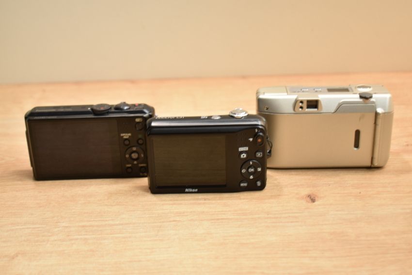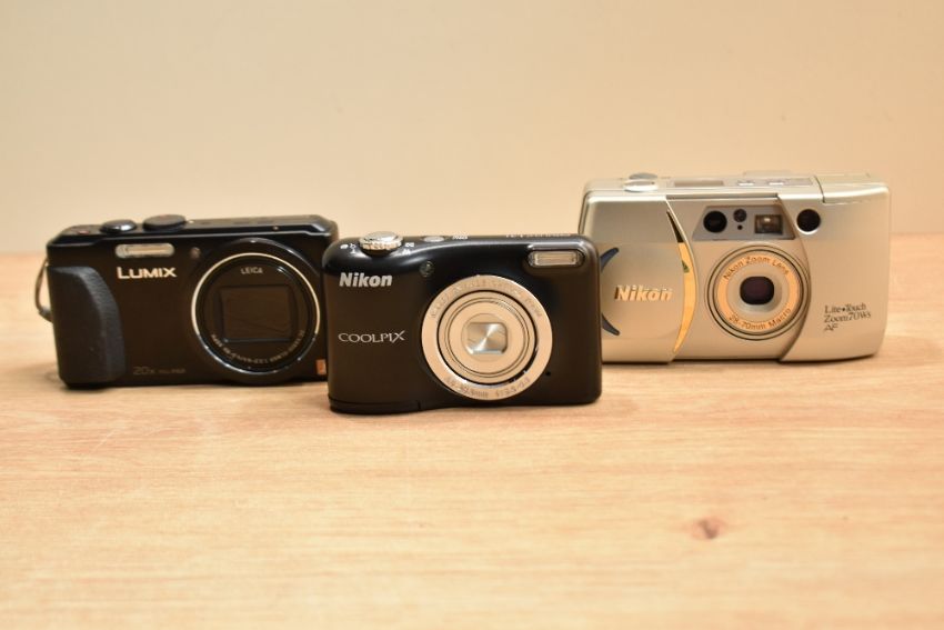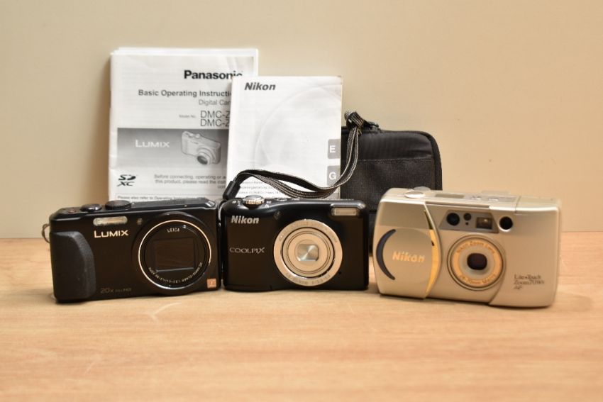 A Canon Lite Touch Zoom 70 WS AF camera, a Nikon Coolpix L31 digital camera and a Lumix DMC TZ40 digital camera