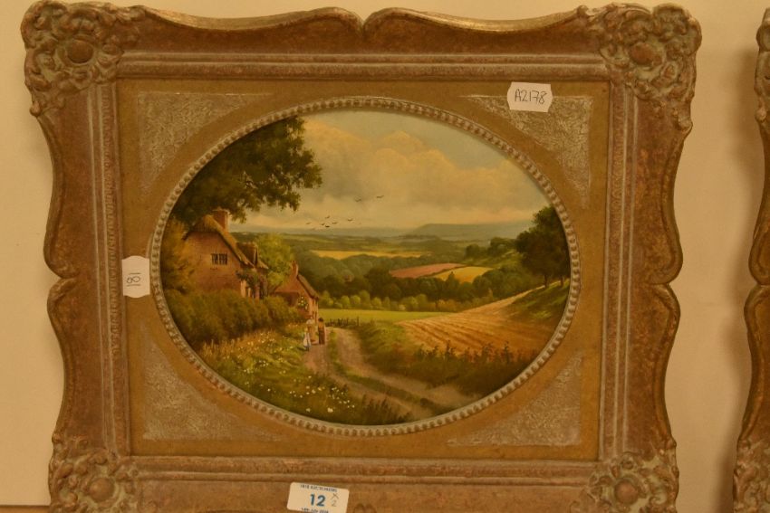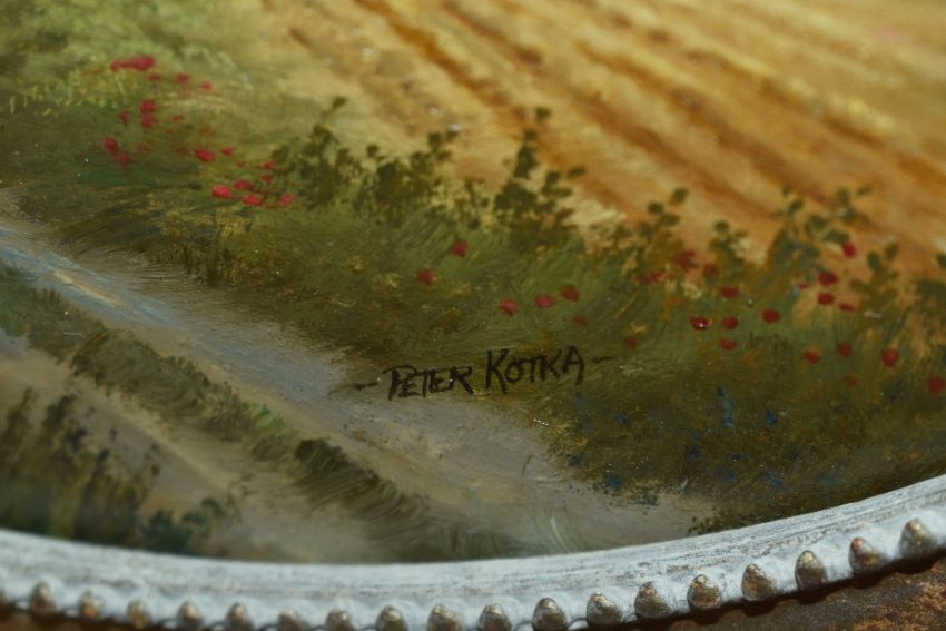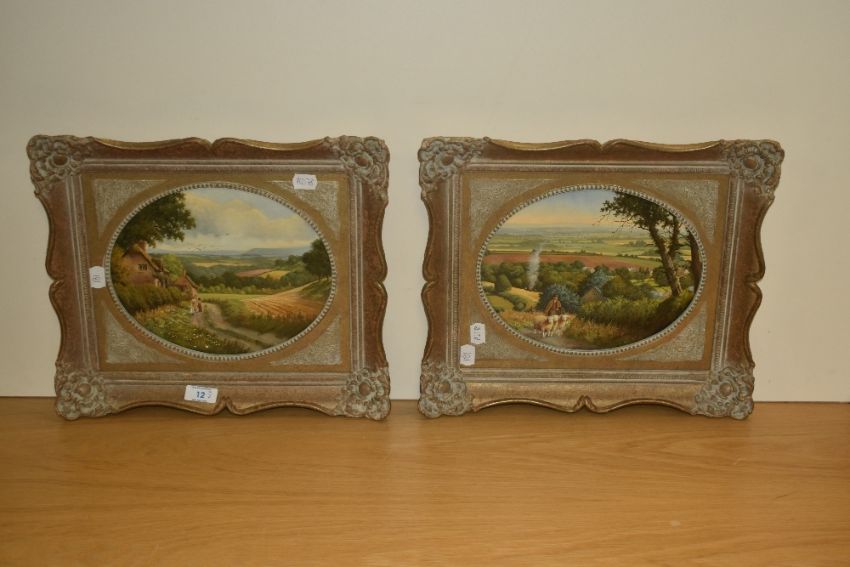 Peter Kotka (b.1951, British), oil on board, Two attractive countryside landscapes of 19th Century style, signed to the lower right, displayed within rustic gilt frames, each measuring 20cm x 23cm, & 32cm x 38cm overall