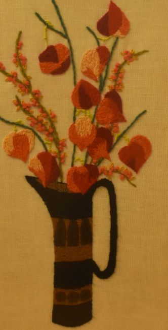 20th Century School, needlework embroidery, A still life arrangement depicting a vase of Chinese Lantern plants, framed and under glass, measuring 32cm x 60cm, & 38cm x 64cm overall