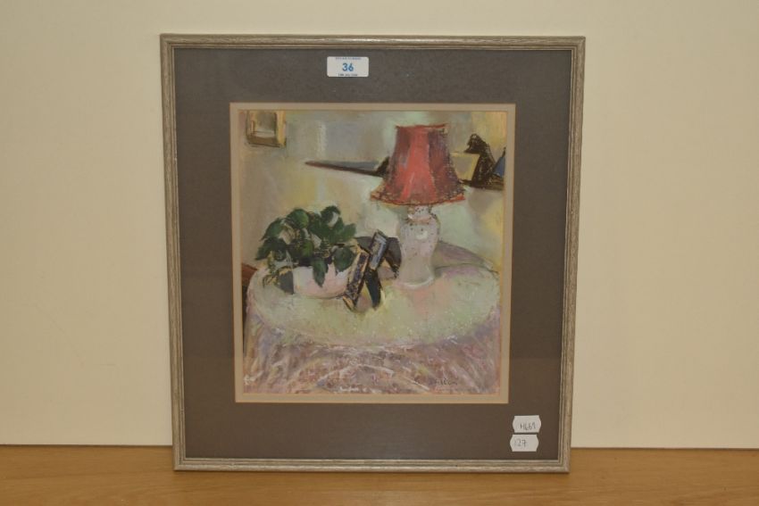 B.Inston (20th Century), pastel, A still life arrangement depicting a vase of flowers, lamp, and picture frames on a circular table top, signed to the lower right, framed, mounted, and under glass, measuring 23cm x 26cm, & 36cm x 40cm overall