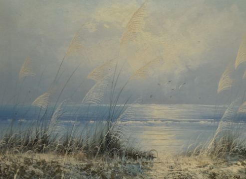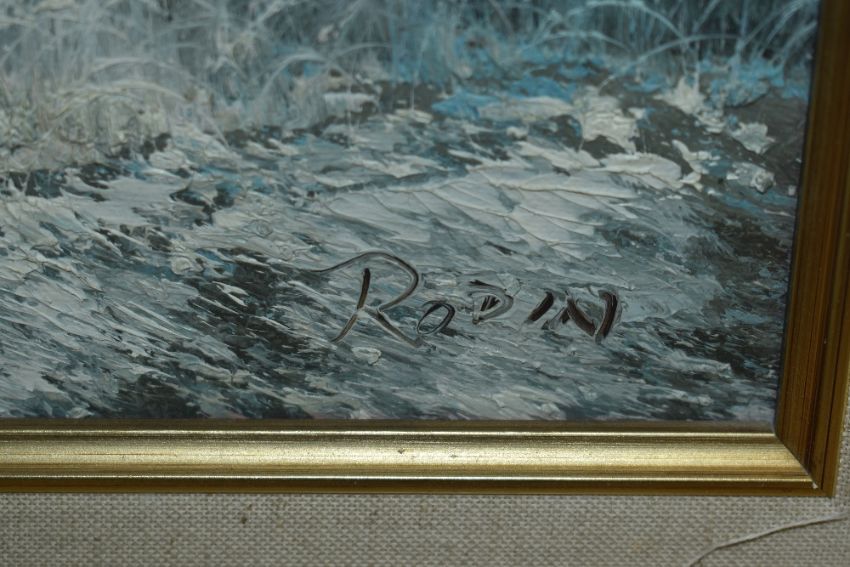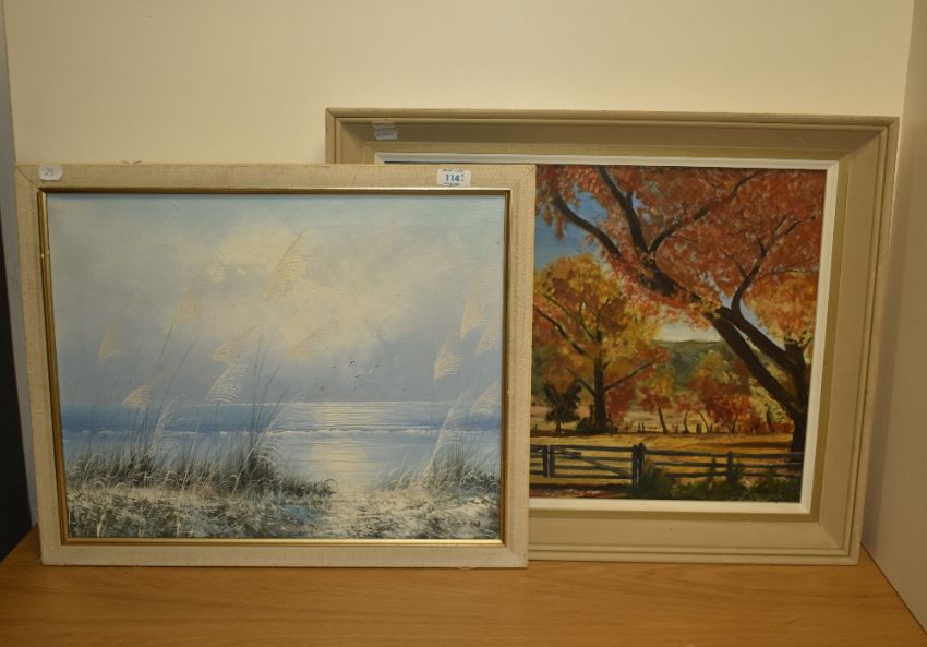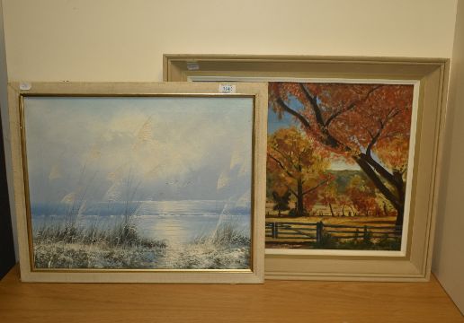 20th Century School, acrylic on canvas, An idyllic winter seascape, signed Rodin to the lower right, framed, measuring 39cm x 49cm, & 46cm x 56cm overall, together with another painting of similar age, by P.Savannah (20th Century), and depicting fields in autumn (2)