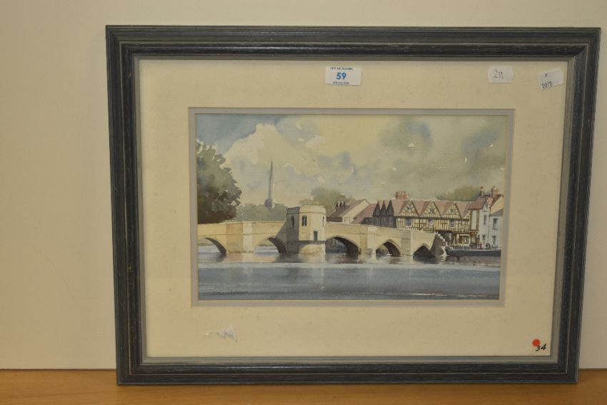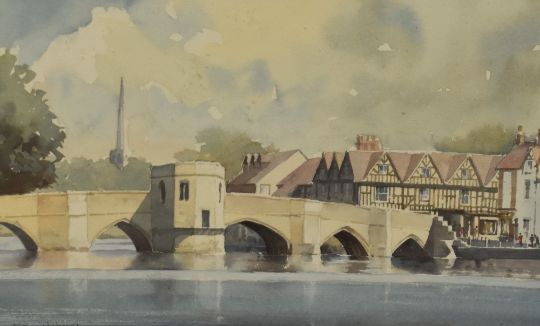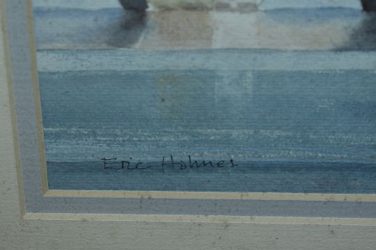 Eric Holmes (20th Century, British), watercolour, St Ives and its bridge, Cambridgeshire, signed to the lower left, framed, mounted, and under glass, measuring 19cm x 31cm, & 38cm x 48cm overall