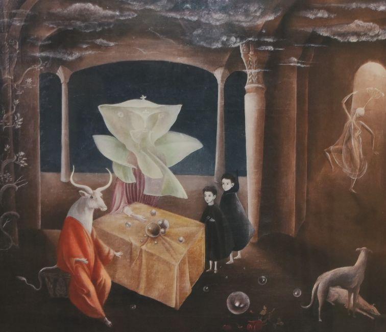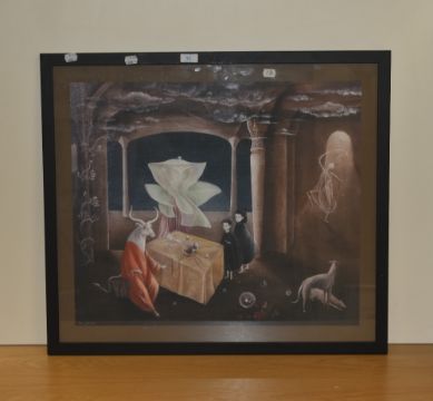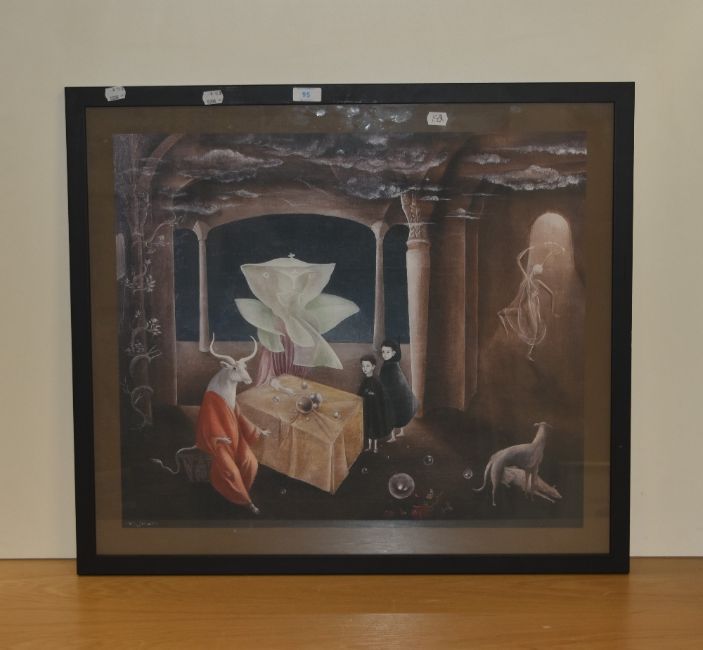 After Leonora Carrington (1917-2011, British-Mexican), coloured print, 'And Then We Saw the Daughter of the Minotaur', a surrealist and fantastical illustration, framed, measuring 58cm x 66cm, & 64cm x 72cm overall