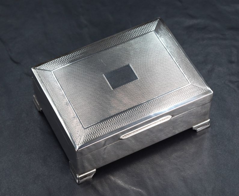 An Elizabeth II silver cigarette box, of hinged rectangular form with engine turned decoration and central vacant rectangular cartouche to lid, wooden lined interior, raised on four step moulded feet, rubbed marks for Birmingham 1961, maker Harman Brothers, 11.5cm L x 8.5cm W x 4.5cm H. Some small dents to corner edges