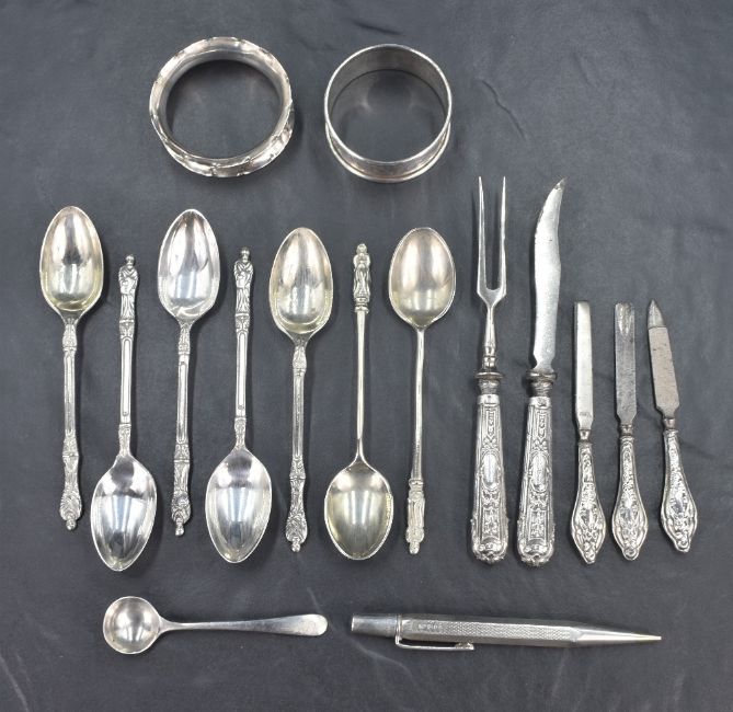 An Elizabeth II silver propelling pencil, having engine turned decoration, marks for London 1960, sold along with a silver mounted manicure set, two silver napkin rings, and silver plated Apostle tea spoons, marks to include Chester and Birmingham, 1900, 1905, 1908, 1912, makers James Swann, Robert Pringle & Sons, 182g gross