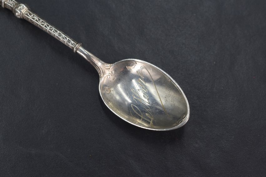 A set of six George V silver Hanoverian teaspoons of rat-tail design, marks for Sheffield 1910, maker John Round & Son Ltd, sold along with an Elizabeth II silver sauce ladle and a silver French souvenir spoon, 143g gross