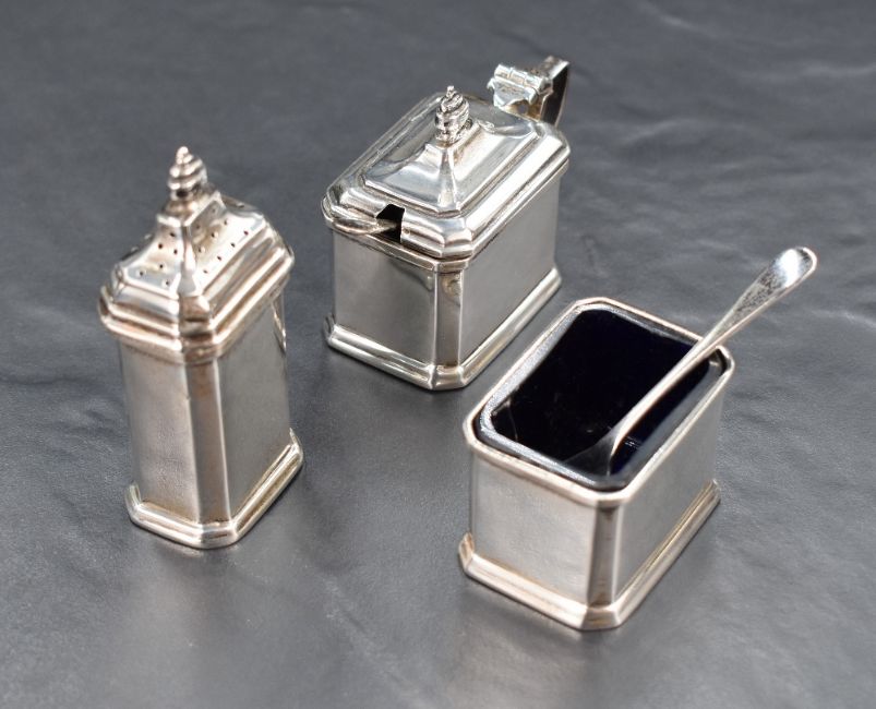 An Elizabeth II silver three-piece condiment set, comprising salt, pepperette and mustard, of canted rectangular design with marks for Birmingham 1968, maker Elkington & Co Ltd, 105g excluding liners