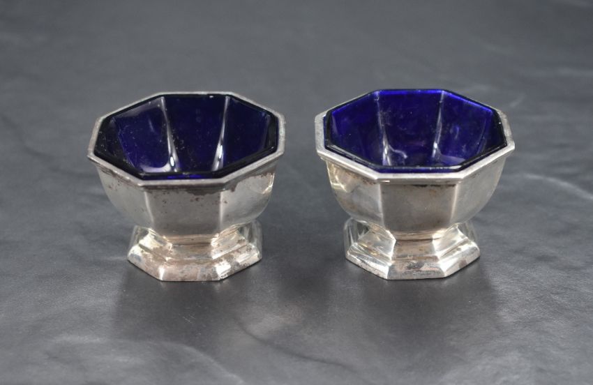 A pair of early 20th century silver condiment pots, of pedestal octagonal form, raised on octagonal step moulded feet with blue glass liners, marks for London with rubbed date marks, maker Page, Keen & Page, 114g