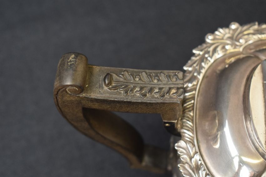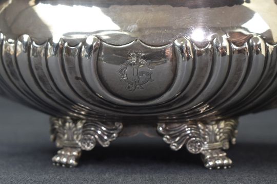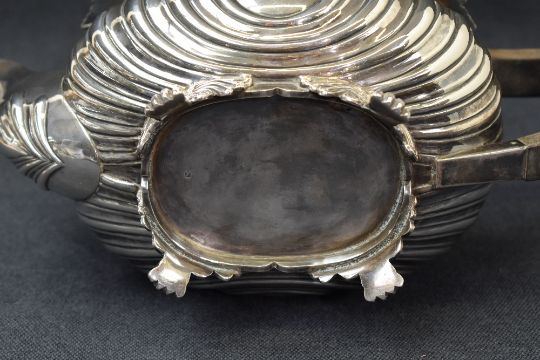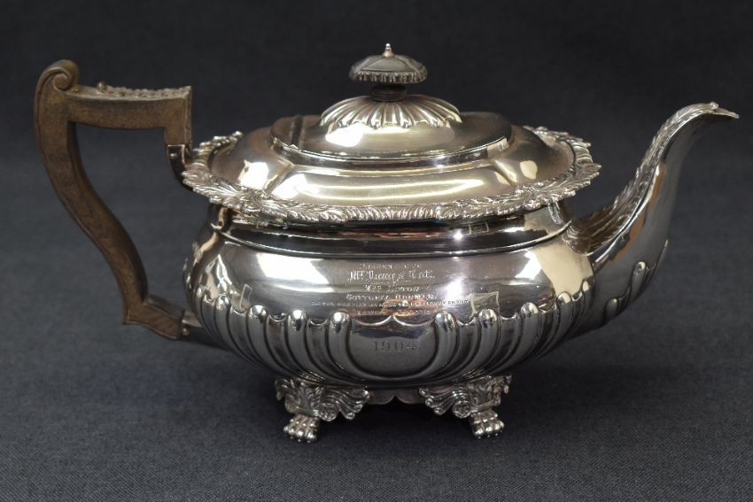 An Edwardian silver teapot, of squat baluster form, having a conforming lobed top with gadrooned and embossed foliage rim, half-gadrooned body with engraved 'JC' monogram to one side and personalised inscription to the other dated 1904, raised on four claw feet with scroll decoration, marks for London 1903, maker Thomas Bradbury & Sons, 845g
