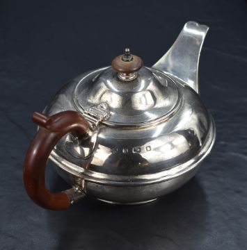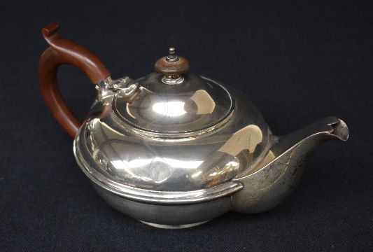 A George V silver teapot, of circular form having a curved generous spout opposed by a scroll handle, with moulded central band raised on a circular foot, marks for Birmingham 1916, maker S W Smith & Co, 518g