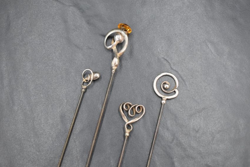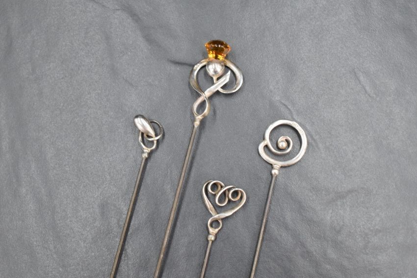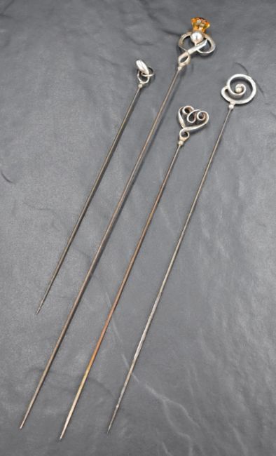 A group of four Charles Horner hair pins, three of plain silver form, the other of a thistle motif of longer length, 18.8g gross