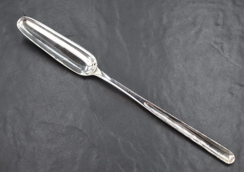 A George III silver marrow scoop, of traditional form with pronounced and angled spoon like drop with flared shoulders to the broader slightly tapering end, the underside with engraved circular laurel cartouche centred by XXIX, opposed by a straight slender tapering end, rubbed marks for London 1799, maker William Eley I & William Fearn, 22.5cm, 45grams, in good condition commensurate with age.