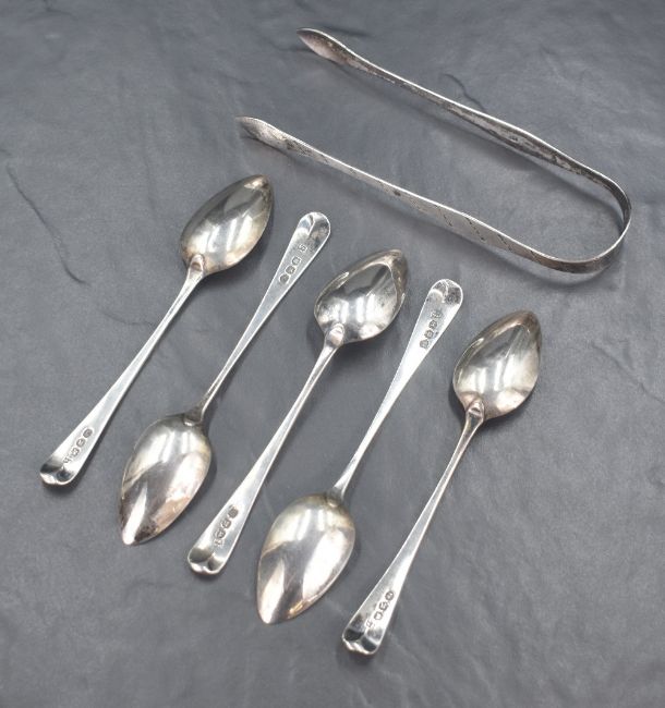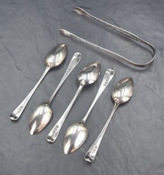 A group of five George III Old English pattern teaspoons, with a matching pair of sugar tongs having bright cut engraving, marks for London 1812, maker Peter & William Bateman, 93g