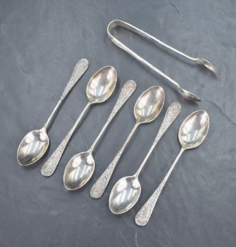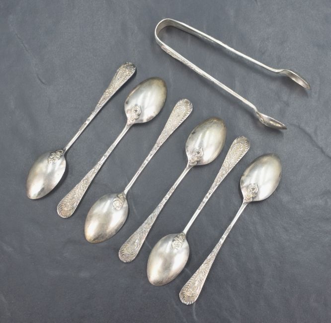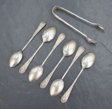 A cased set of six late Victorian silver teaspoons with a matching pair of sugar tongs, having embossed scroll work to the front and reverse of the terminals and to the reverse of the bowls, marks for Sheffield 1900, maker Mappin Brothers, 119g gross