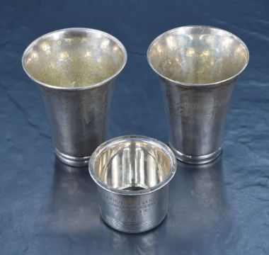 Two early 20th century Danish silver cups, of flared cylindrical form one having planished decoration to body, the other having a plain body, both with personalised engraving, marks for Copenhagen 1930 & 1934, Assayer's marks for Christian F. Heise and Johannes Siggaard, sold along with a smaller Danish silver cup, of circular form, having a flared rim, marks for Denmark stirling silver, 240g gross