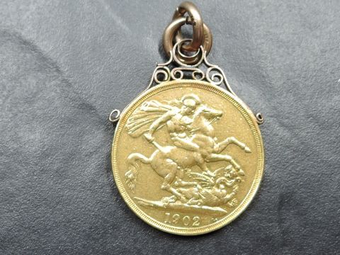 A 1902 Edward VII Gold Double Sovereign, Royal Mint having 9ct Gold Mount attached