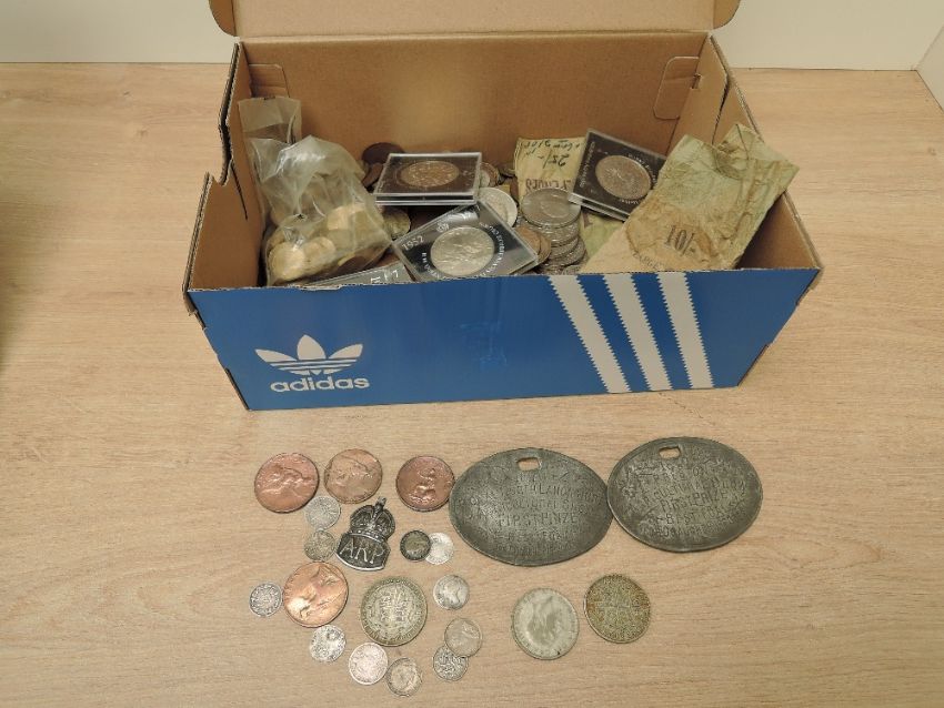 A box of GB Coins including small amount of Silver, 1920, 1927 and 1940 Half Crowns, 1836 Threepence in good condition, Queen Victoria and later Threepences x 8, three world Silver Coins including Canada 1916 10 Cents, French 1917 50 Centimes and US 1875 One Dime and a Silver ARP badge, total Silver weight 68g along with large amount of GB Coins including 1799 George III Half Penny, Pennies including Queen Victoria, Threepences, modern Crowns, etc also two 1870 Preston and Royal North Lancashire Best Foal plaques
