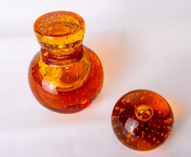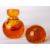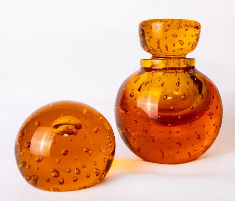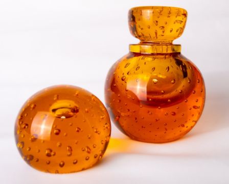 A Whitefriars glass controlled bubble inkwell, in amber, the stopper with etched number 22 to underside, designed by William Wilson, catalogue number 9053, sold together with an encased bubble paperweight in amber, catalogue number 9308. Normal base wear to both.