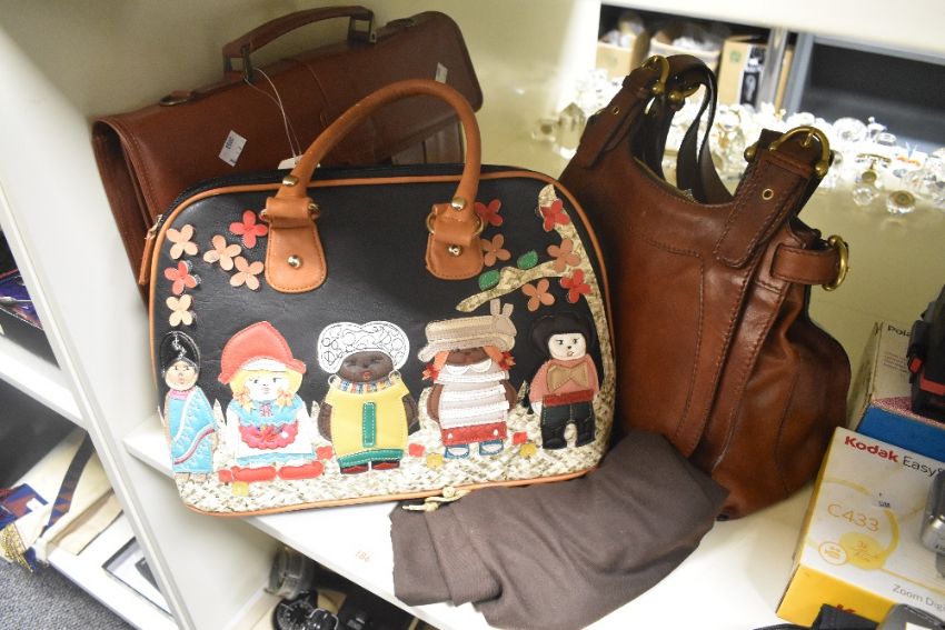 A leather 'The Bridge' shoulder bag, a tan leather Craftsman satchel and a ladies applique bag depicting women of the world with matching purse.