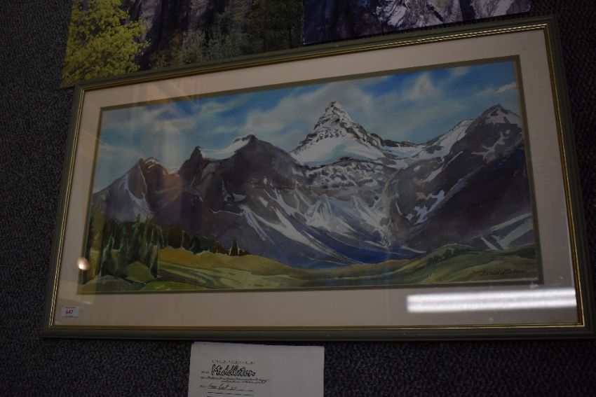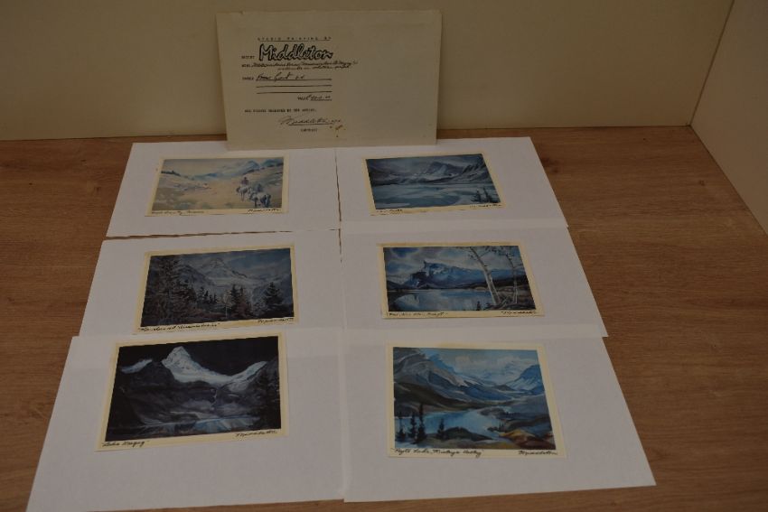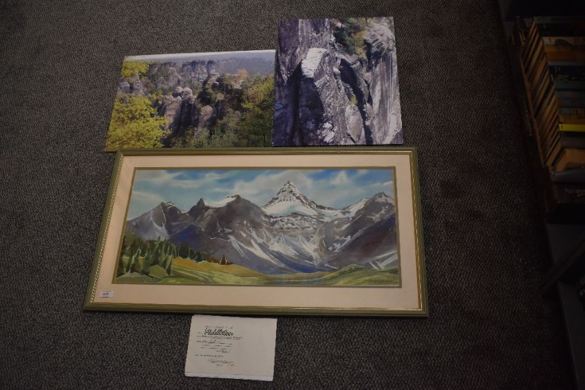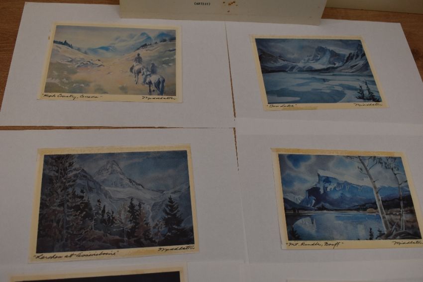 Mountaineering. A watercolour of Mt. Assiniboine by Holly Middleton. Measures: 35' x 20' approx. With; six small watercolour proofs by the same artist, all signed. Plus two modern photograph prints of rock climbing in Dresden, Germany.
