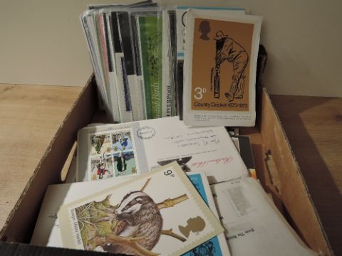 GB - RANGES OF PRESENTATION PACKS, ODD COVERS, PHQ - INCLUDING CRICKETER PHQ no 1 Shallow box with range of presentation packs from 1970's and 80's odd PHQ cards, including County Cricket (odd corner dints)