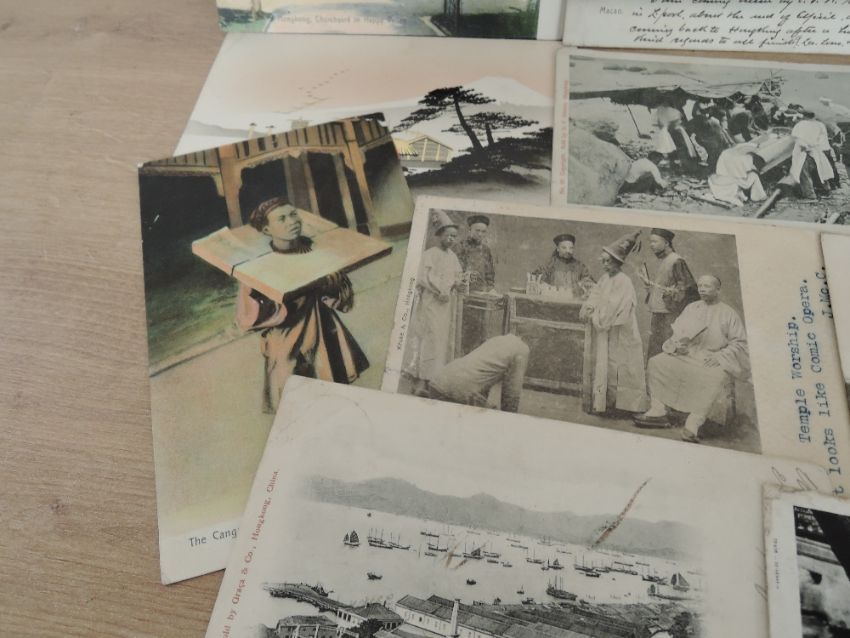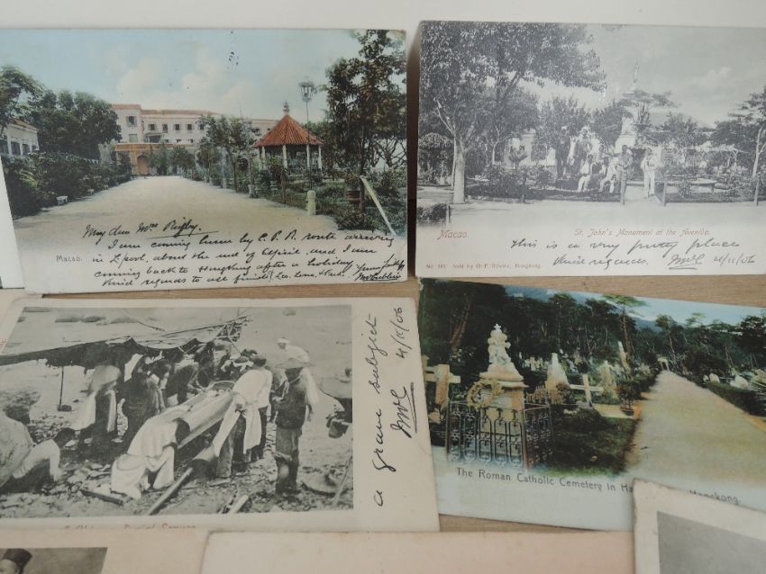Small collection of cards from Hong Kong and Macau, along with a couple of Japanese cards, dozen cards in total including The Hong Kong- The Stocks, The Gas Works, various views, The Cangue, St Johns in Macao, Happy Valley Roman Catholic Cemetry, Chinese Burial Service, Churchyard in Happy Valley, Hong Kong, odd card with faults, and dinted corners etc, but fascinating bunch of items