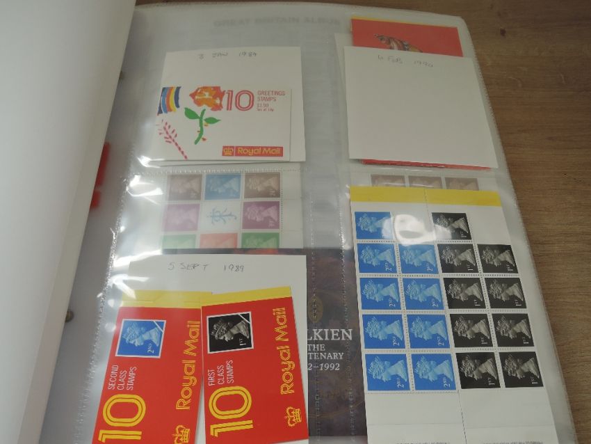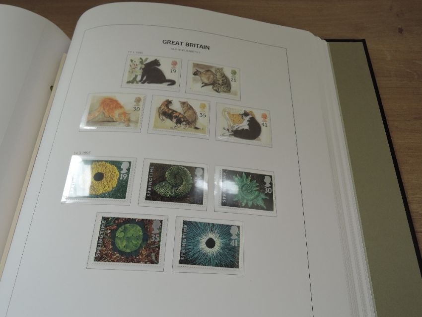 GB 1952's-2000 UNMOUNTED MINT COLLECTION IN TWO SG ALBUMS - NR COMPLETE Two luxury Dave (marked SG to spines) with cases with GB unmounted mint collection. Commencing with the Tudor Crowns set MNH, with most commemorative issues noted (most of the phosphors not present). However from 1967 onwards a complete run of commemorative issues to 2000. Good run of machins from 1970's & 80's, 1988 high value castles etc. Whilst present the Regional leaves to rear are largely empty. Second volume has ranges of booklets and panes to front and then a complete run of commemoratives, includes £10 Britannia etc. Good few hundred pounds in face, and albums a small fortune alone from new.