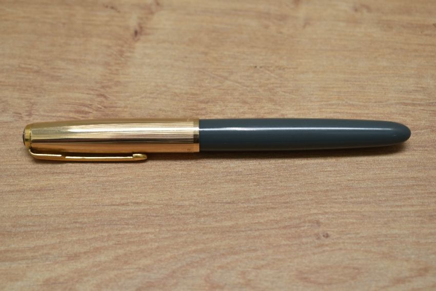 A Parker 51 aerometric fill fountain pen in navy grey with a gold filled cap