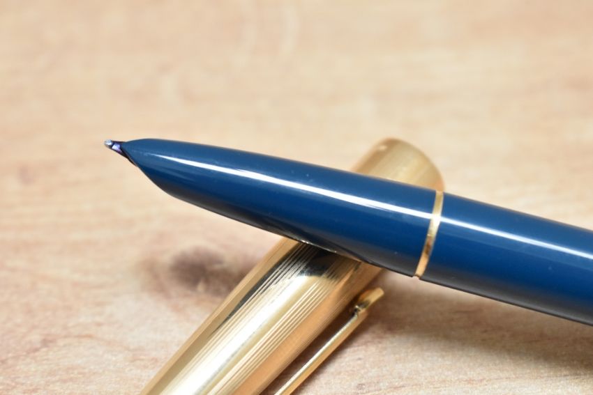 A Parker 51 Custom aerometric fill fountain pen in teal with a rolled gold cap