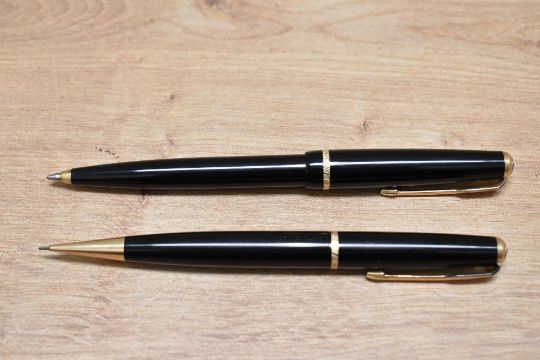A Parker Duofold ballpoint pen and propelling pencil set in black with narrow decorative band. Boxed with a Parker Sonnet ballpoint in matt black and a Parker ballpoint in blue with stainless steel cap
