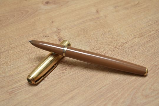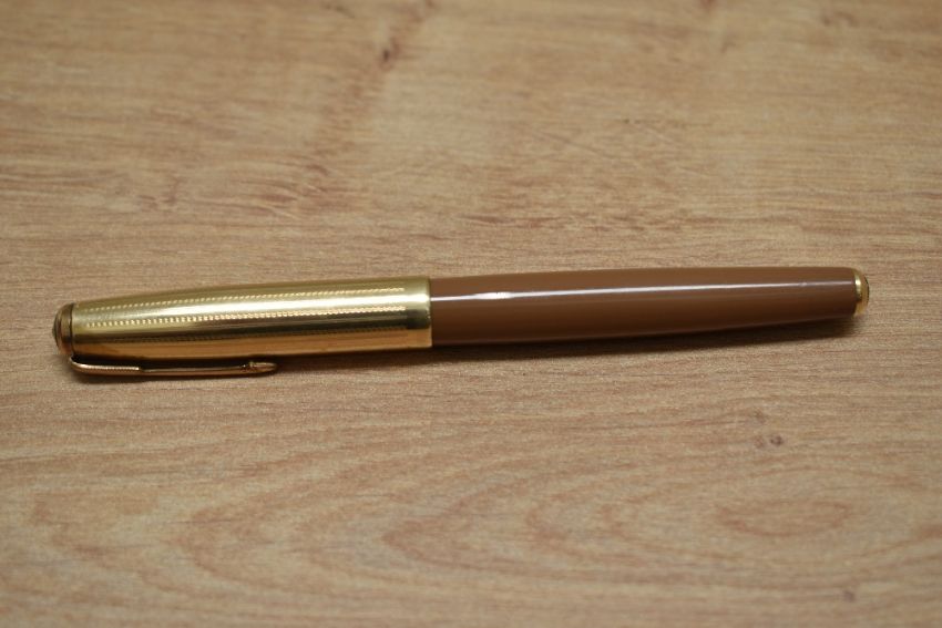 A Parker 51 aerometric fill fountain pen in mustard with a rolled gold cap having twin jewel cap