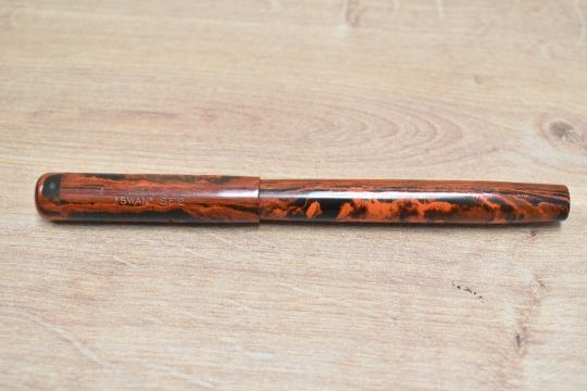 A Mabie Todd & Co Swan Self Filling lever fill fountain pen in black and red hard rubber with clipless cap having a Swan 2 14CT Mabie Todd & Co made in England nib