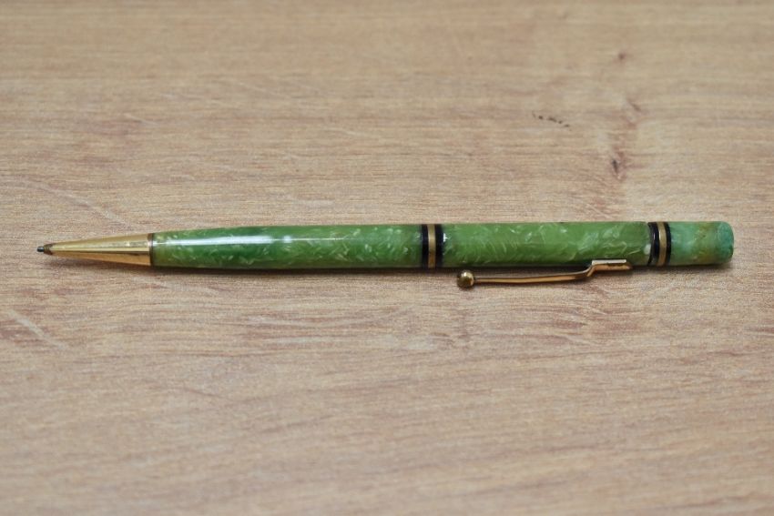 A Mabie Todd Swan propelling pencil with two gold on black band (142/50) in jade green