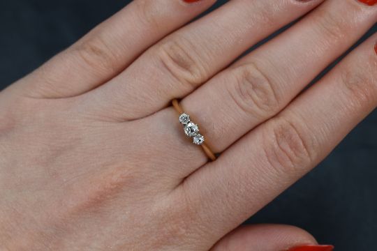 A diamond trilogy ring having three old cut diamonds in claw set mounts, approx 0.225ct total on a yellow metal loop stamped 18ct, size M & approx 2.4g