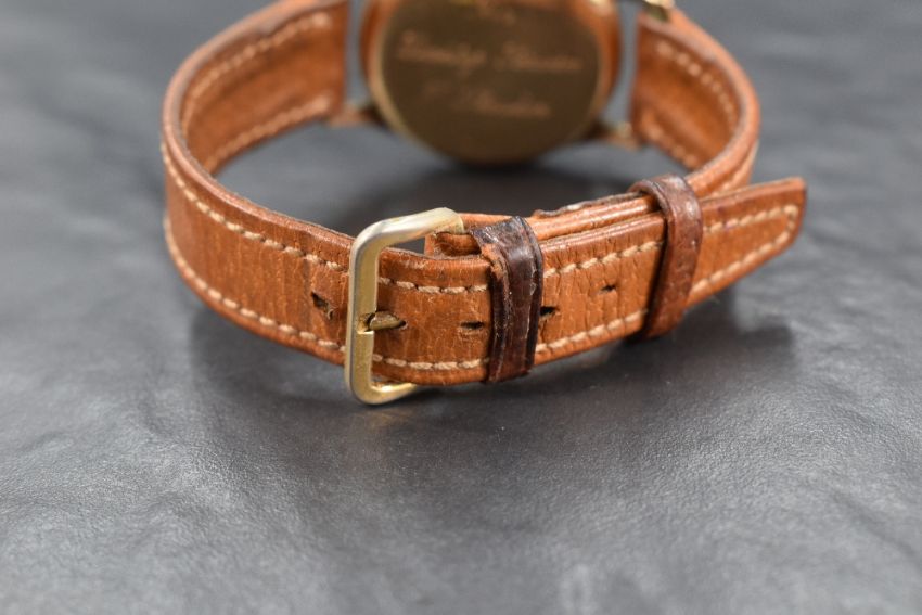 A gent's vintage 9ct gold manual wrist watch by Garrard having Arabic Numeral dial with subsidiary seconds on a silvered face in plain gold case having Dunlop presentation inscription en verso and a tan leather strap, 33mm case, with box, watch working when wound but we do not test for functionality