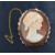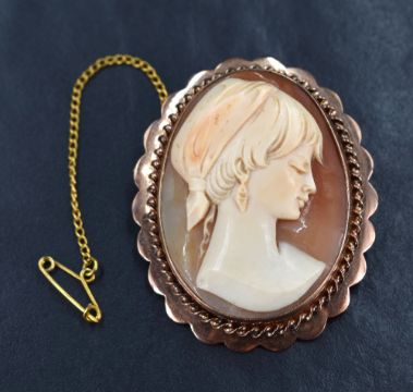 A shell cameo depicting a maiden in profile wearing a head scarf, within a rose metal mount with twisted rope detail and safety chain, 15.6g