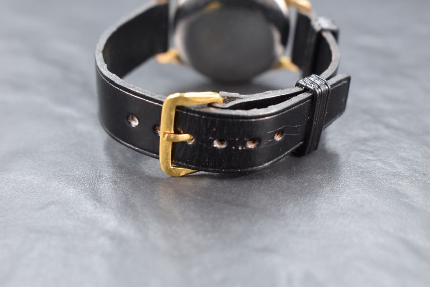 A gent's 1960's Smiths Astral National 15 manual wrist watch having Arabic quarter numerals and baton dial with a subsidiary seconds dial on a silvered face in a gold plated case with a black leather strap. 34mm case, watch working when wound but we do not test for functionality