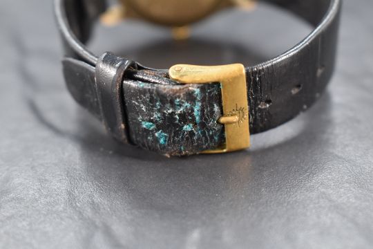 A gent's 9ct gold Record Deluxe manual wrist watch having Arabic numeral and baton dial to silvered face in a plain case bearing presentation inscription en verso and black leather strap, 34mm case, with box, watch working when wound but we do not test for functionality