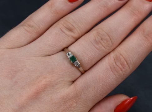 A three stone diamond and emerald ring, the central small square emerald flanked by two pave set diamonds in a raised mount on a yellow metal shank stamped 18ct, size N & approx 2.2g
