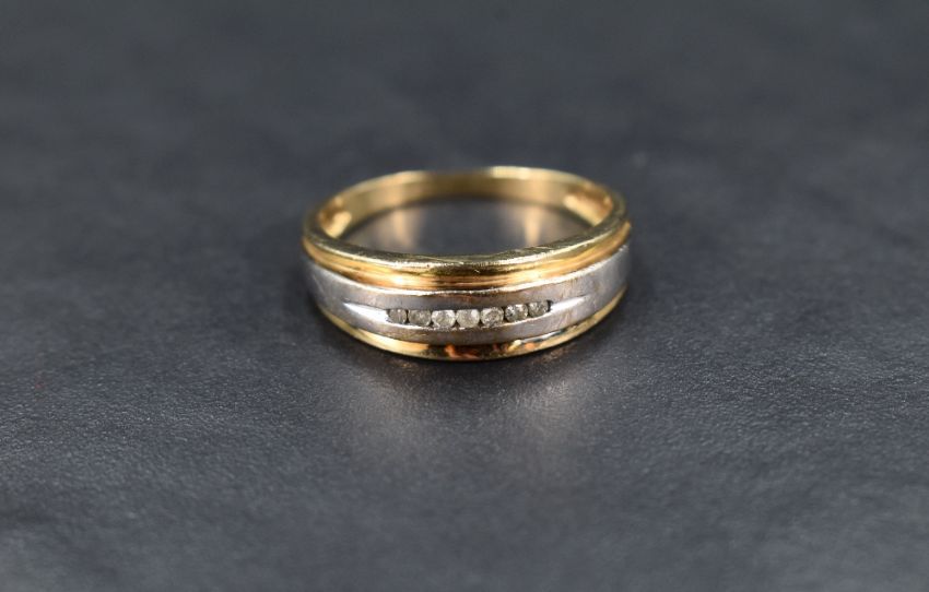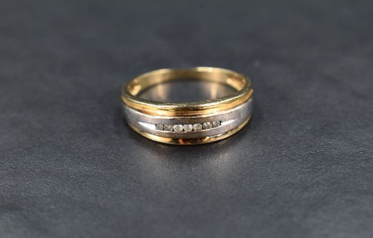A 9ct two-tone gold ring, the white gold platform set with seven round cut diamonds in a tension setting, on a yellow gold shank, ring size V, 3.7g