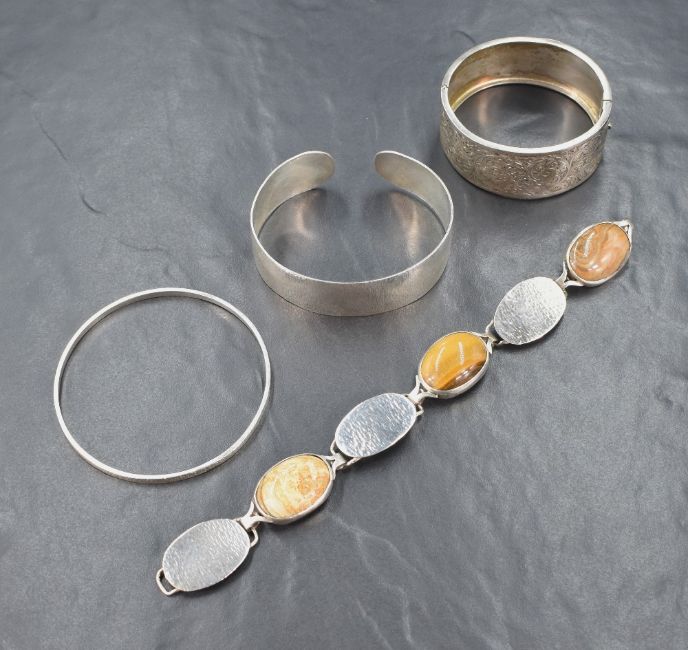 Three silver bangles of various forms and an artisan made white metal bracelet stamped silver having alternate polished stone and hammered silver panels