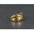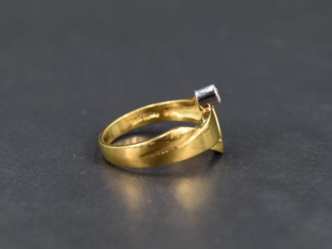 A yellow metal band ring stamped 18ct of stylised form having an inset collared diamond solitaire, approx 0.128ct, size P & approx 5.4g